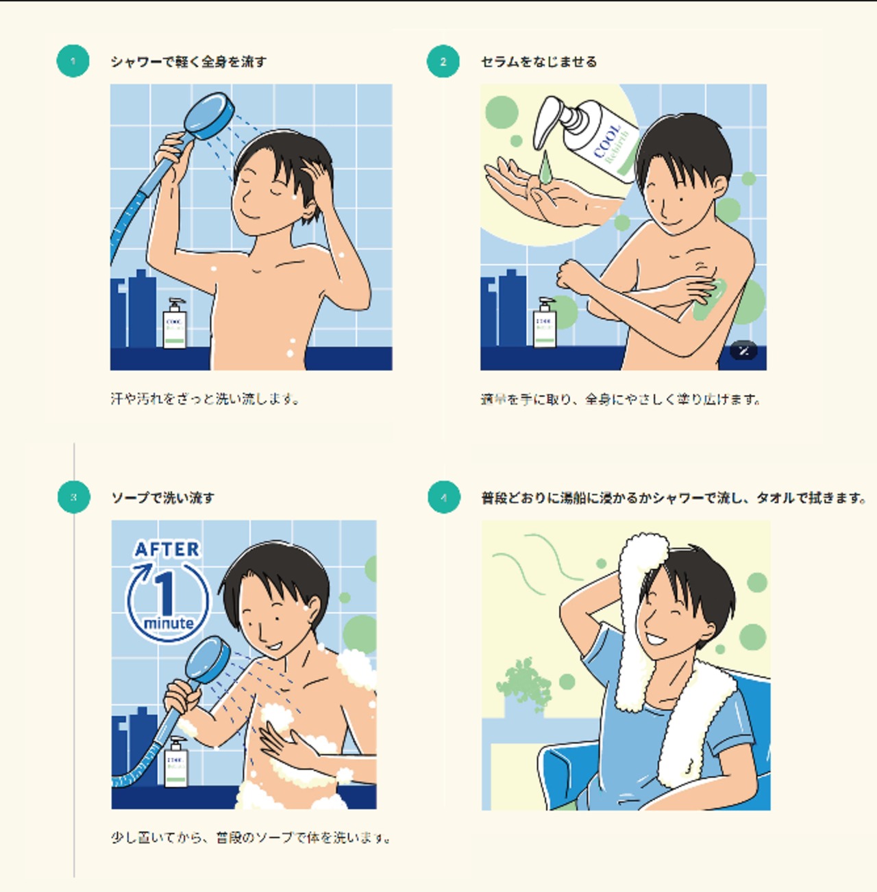 いつものバス・シャワーの手順にプラスするだけ。