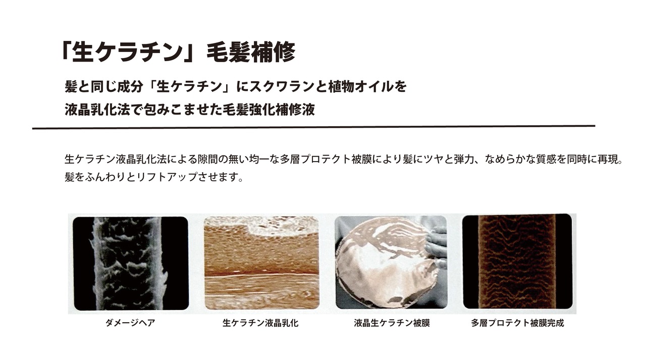 【ケラブローリフトアップローション】は、洗い流さないトリートメントではありません。髪と同じ成分、生ケラチンにスクワランとホホバ種子油を液晶乳化法で包みこませた毛髪強化補修液です。